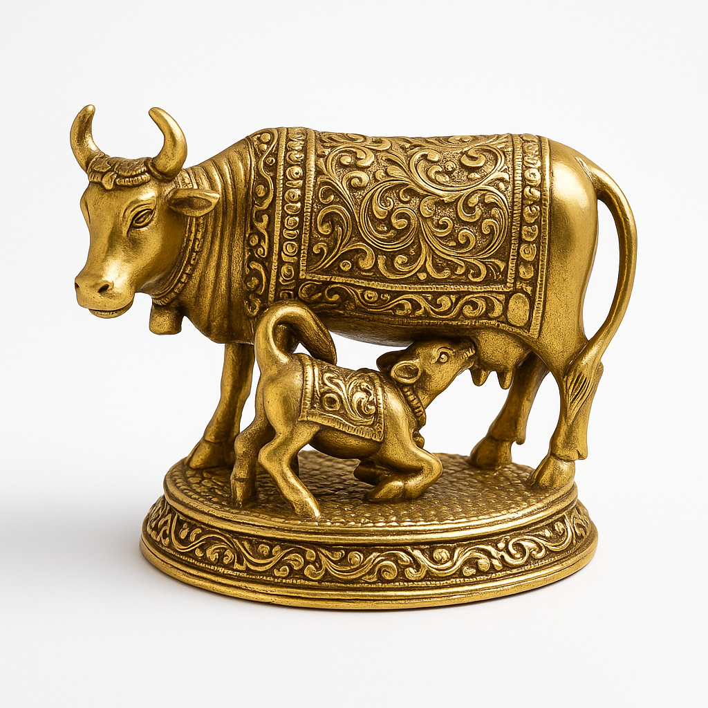 Celebrate the sacred bond of motherhood and abundance with this brass idol of Kamdhenu cow with calf, a revered symbol in Hindu mythology.